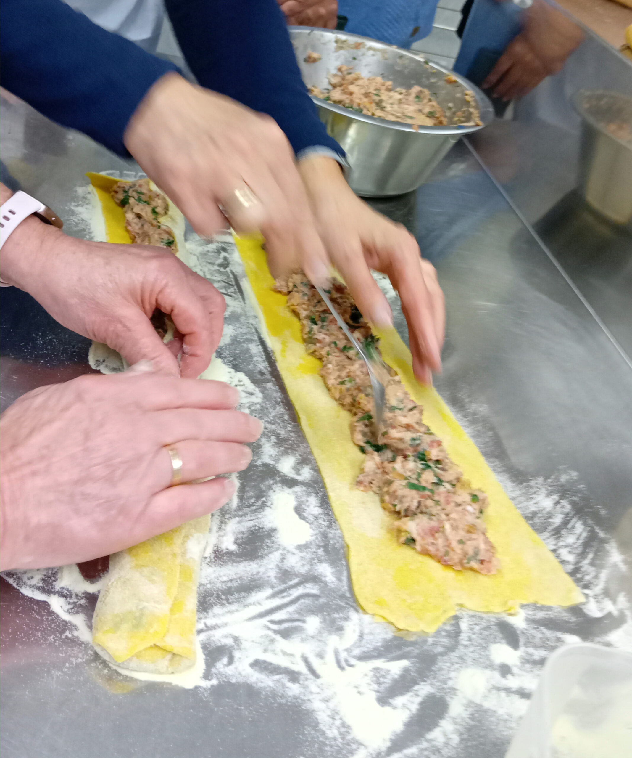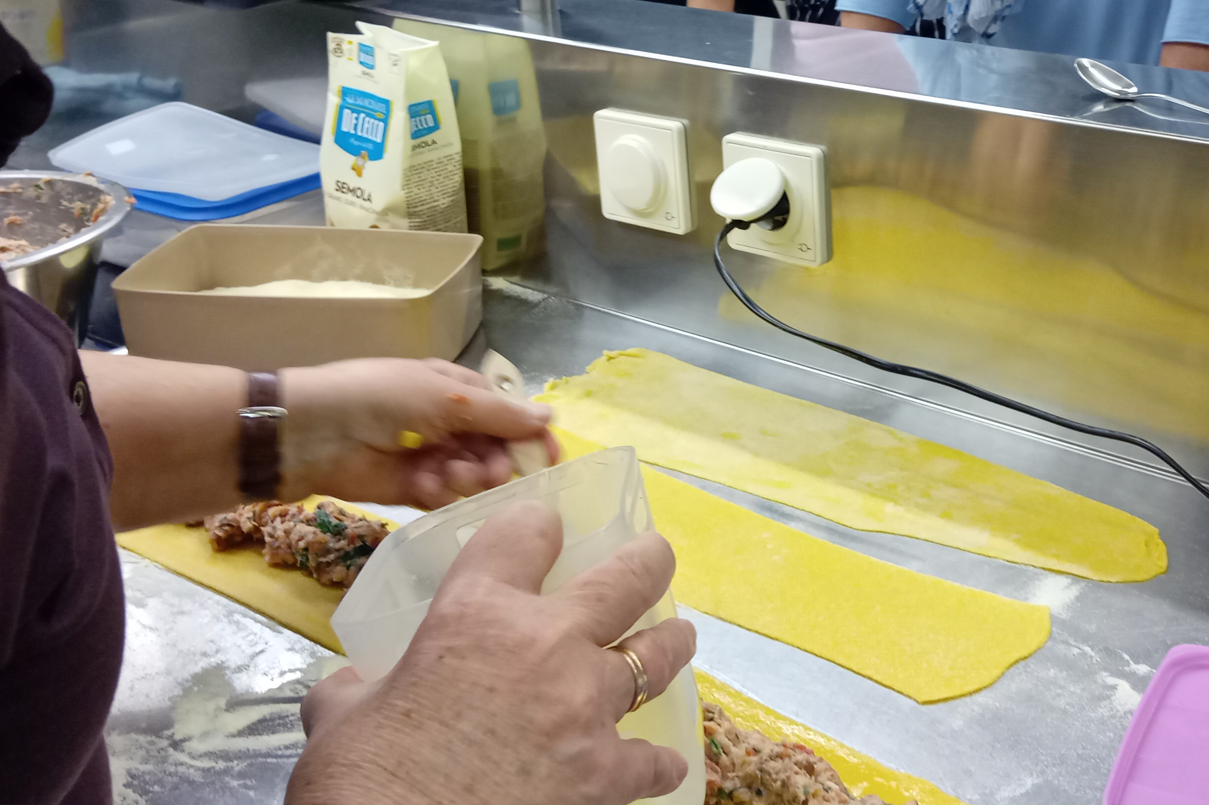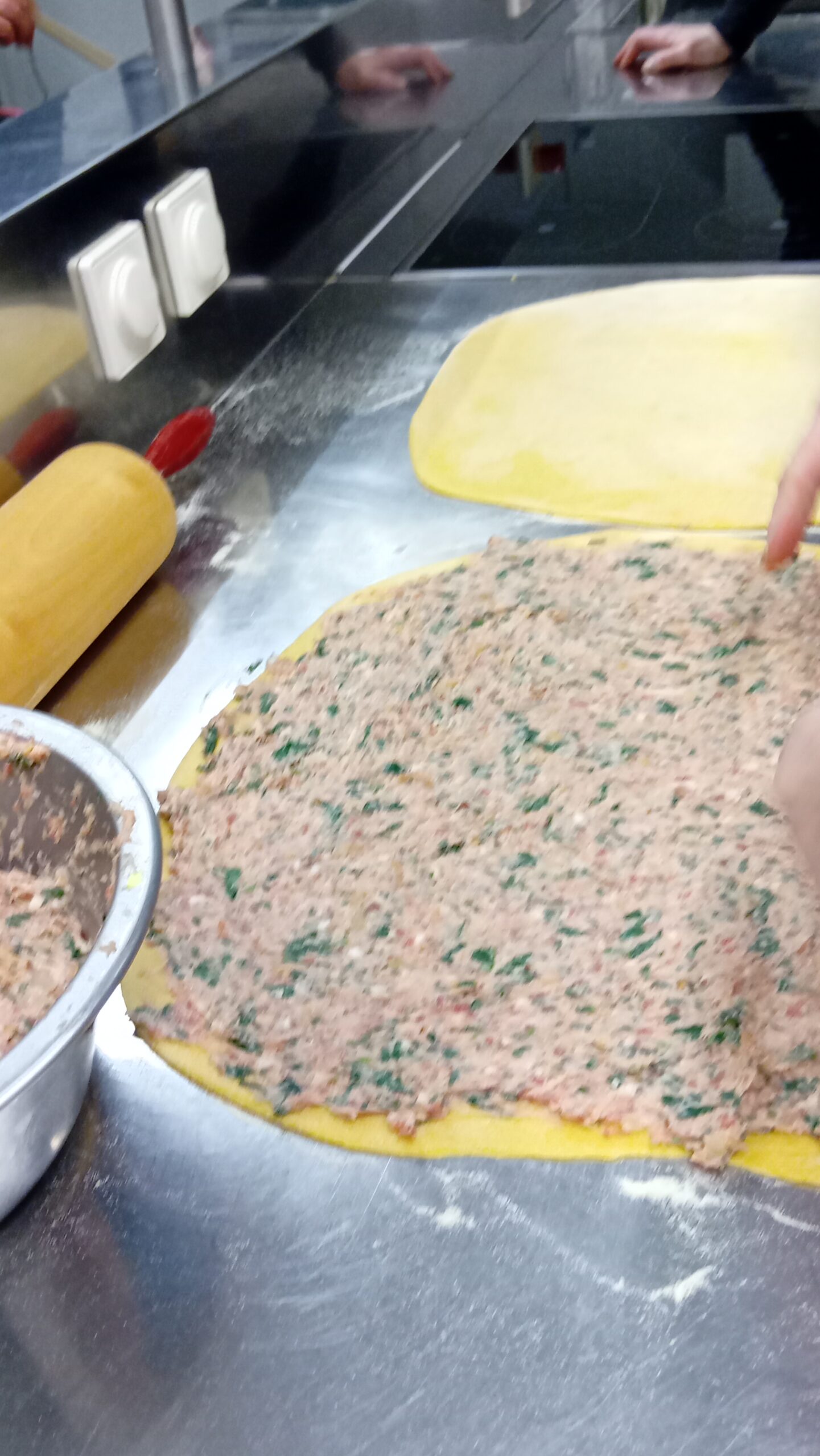 Nebenher hatten einige Frauen die Füllungen zubereitet, eine mit Hackfleisch, Bratwurstbrät und Speckwürfelchen, eine vegetarische Variante mit Spinat und Ricotta.