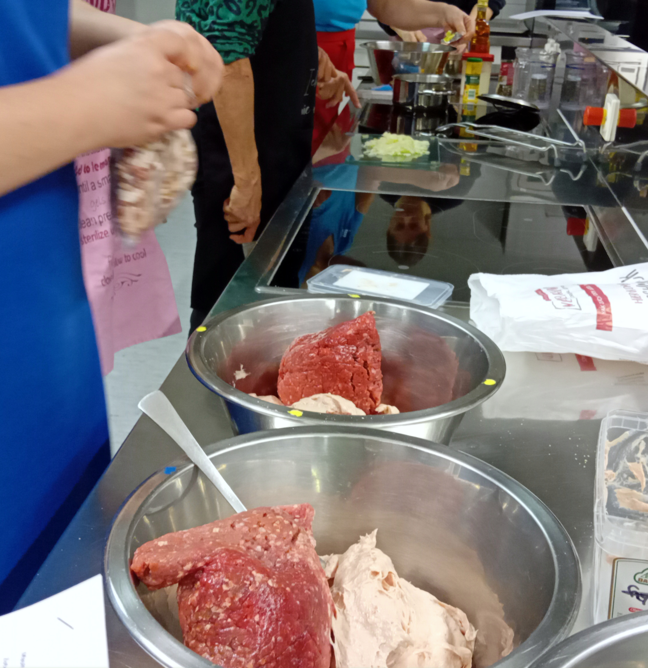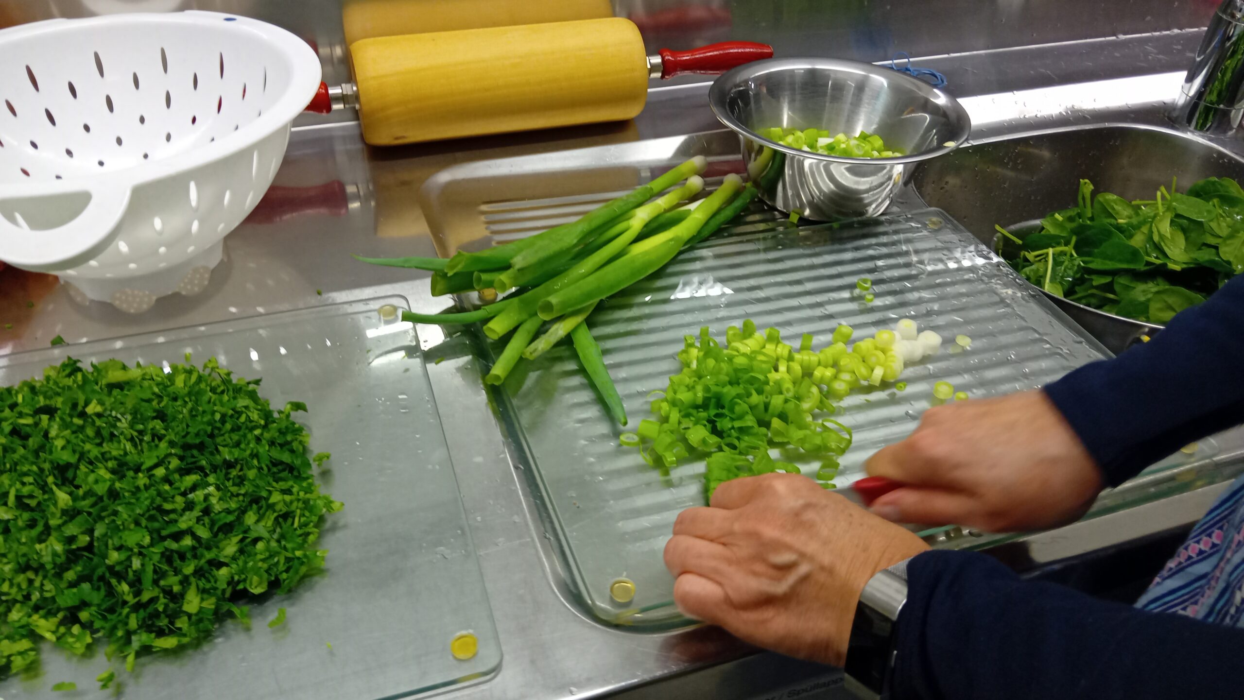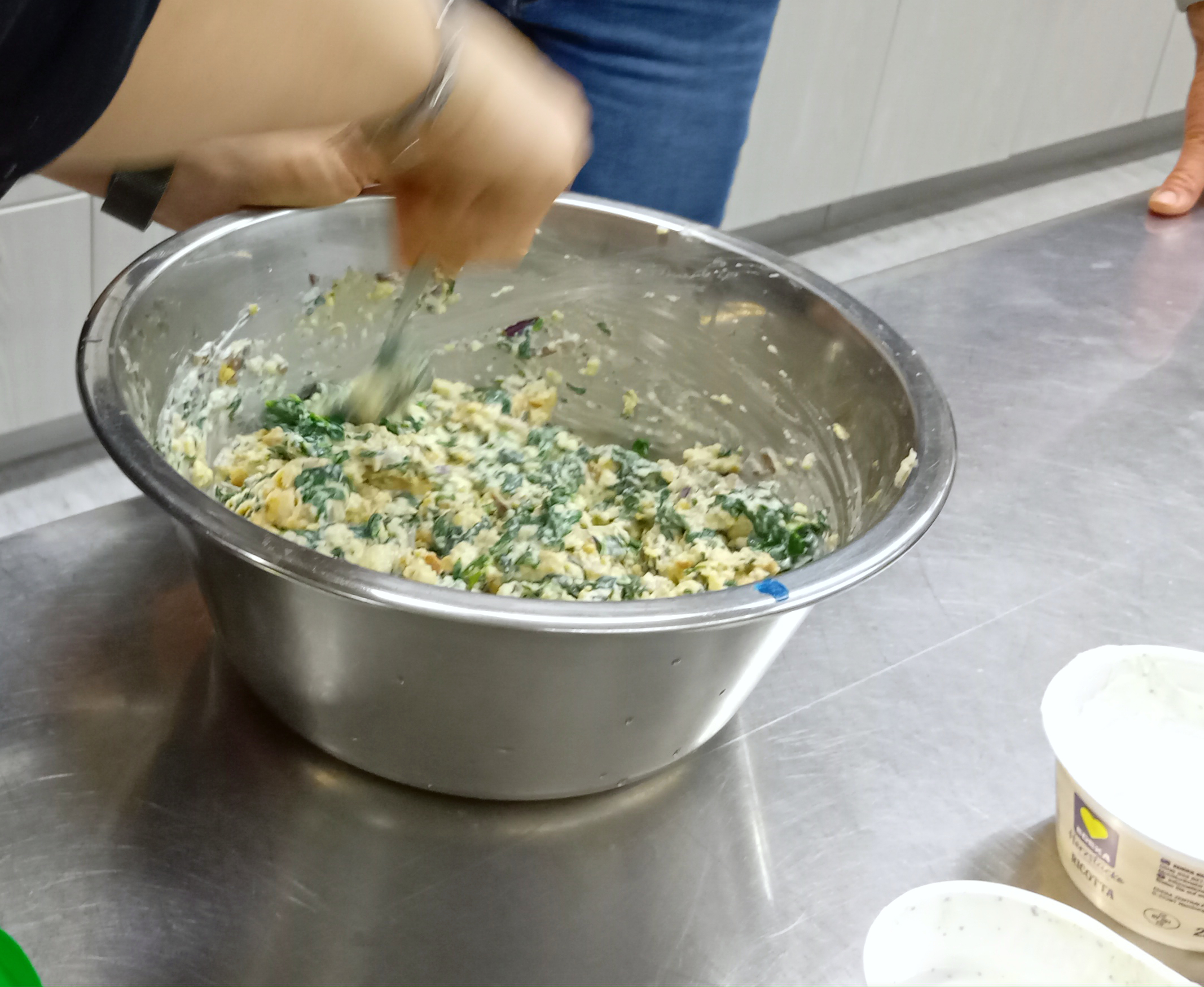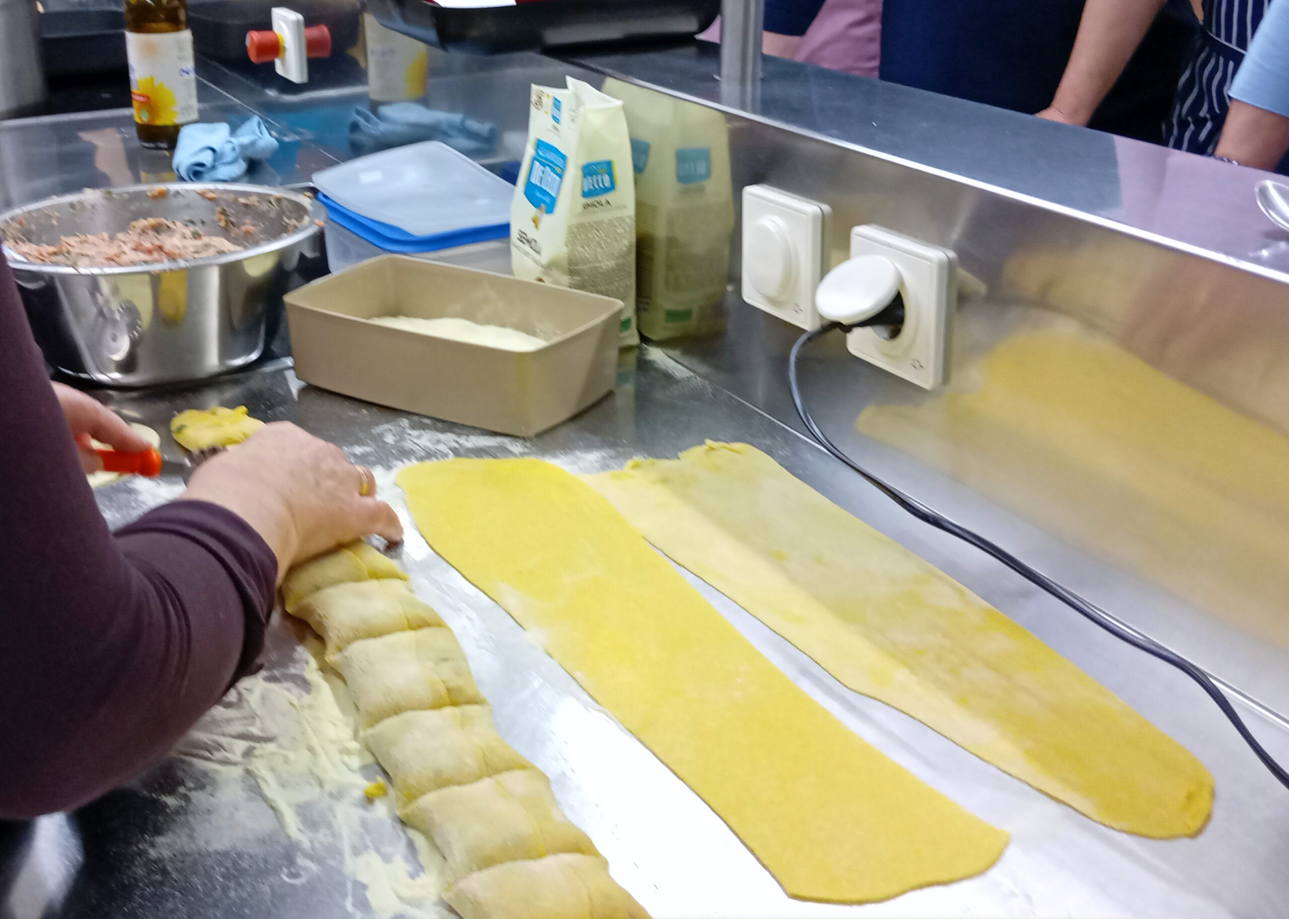 Nebenher hatten einige Frauen die Füllungen zubereitet, eine mit Hackfleisch, Bratwurstbrät und Speckwürfelchen, eine vegetarische Variante mit Spinat und Ricotta.