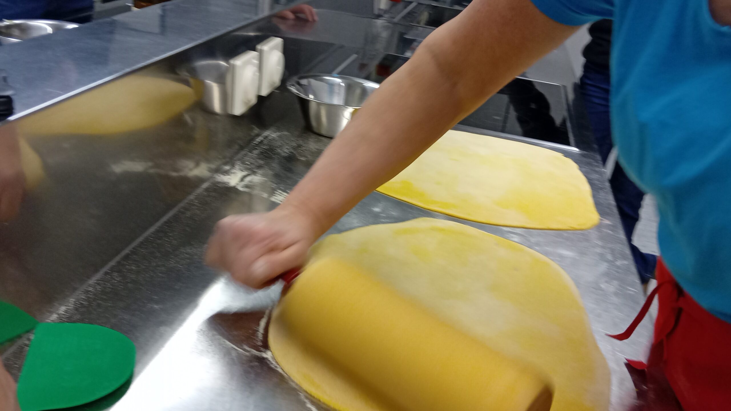 Birgit zeigte später mit dem neu zubereiteten Teig, dass man einen Nudelteig auch mit einem Wellholz auswellen kann. Sie rollte zwei ovale Fladen aus, bestrich einen mit der Fülle und deckte den zweiten darüber. Ebenfalls mit einem Teller teilte sie den doppelten Nudelfladen danach in Rauten ein – so geht es auch. Oder man kann den bestrichenen Teig aufrollen.