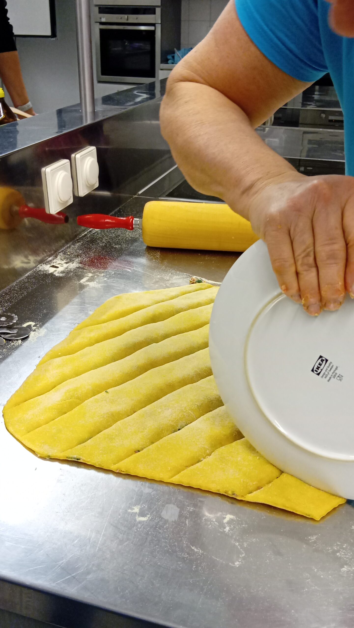 Dann nahm sich Brigitte einen Teller und machte damit in regelmäßigen Abständen Kerben in die gefüllte Teigbahn. Die Kerben wurden anschließend mit einem Teigrädchen geschnitten und die Maultaschen-Teiglingen waren fertig.