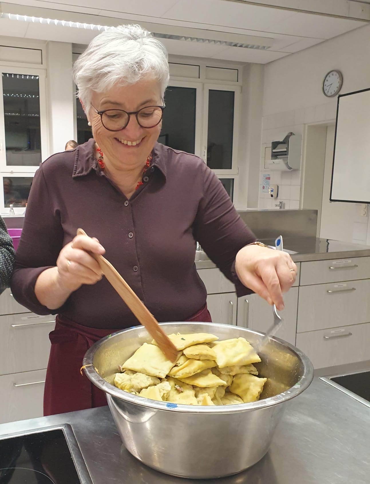 Schon beim Zuschauen hat man viel profitiert. Aufmerksam auf die vielen kleinen Tipps nebenher zu hören hat den Teilnehmenden viel Wissenswertes vermittelt. So gab es Empfehlungen zum Kochen in der Brühe oder zum Einfrieren der Maultaschen, was man tun kann, wenn der Teig oder die Fülle zu feucht oder zu trocken ist, was besonders gut schmeckt oder wo man die frischen Lebensmittel einkaufen kann usw.