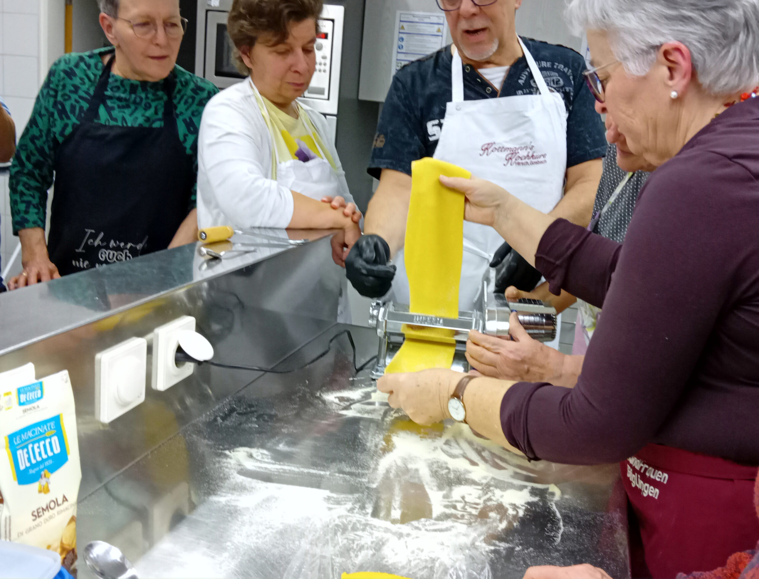 Am Workshopabend war Brigitte Hahn hauptsächlich für die Maultaschen zuständig, Birgit Jesser kümmerte sich um den obligatorischen Kartoffelsalat, der nun mal zum Maultaschen-Essen gehört. Brigitte zeigte, wie schnell es mit einer Küchenmaschine geht, einen Nudelteig herzustellen. Weil dieser Teig zunächst für mindestens eine halbe Stunde in den Kühlschrank muss, hatte sie schon zwei Teige vorbereitet, die man sofort verarbeiten konnte. Dazu kam ihre Nudelmaschine zum Einsatz. Mit dieser konnten ca. 15 cm breite Teigbahnen ausgerollt werden.