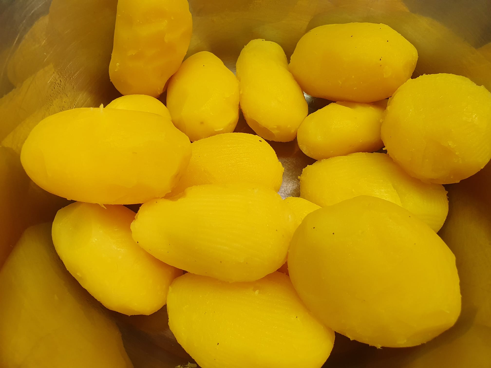 Anschließend etwas auskühlen lassen, sodass man sie schälen kann. Man sollte sie noch warm schälen, da sich so die Schale leichter löst. Die Kartoffeln dann vollends auskühlen lassen und in dünne Scheiben schneiden oder hobeln – so werden sie gleichmäßiger.