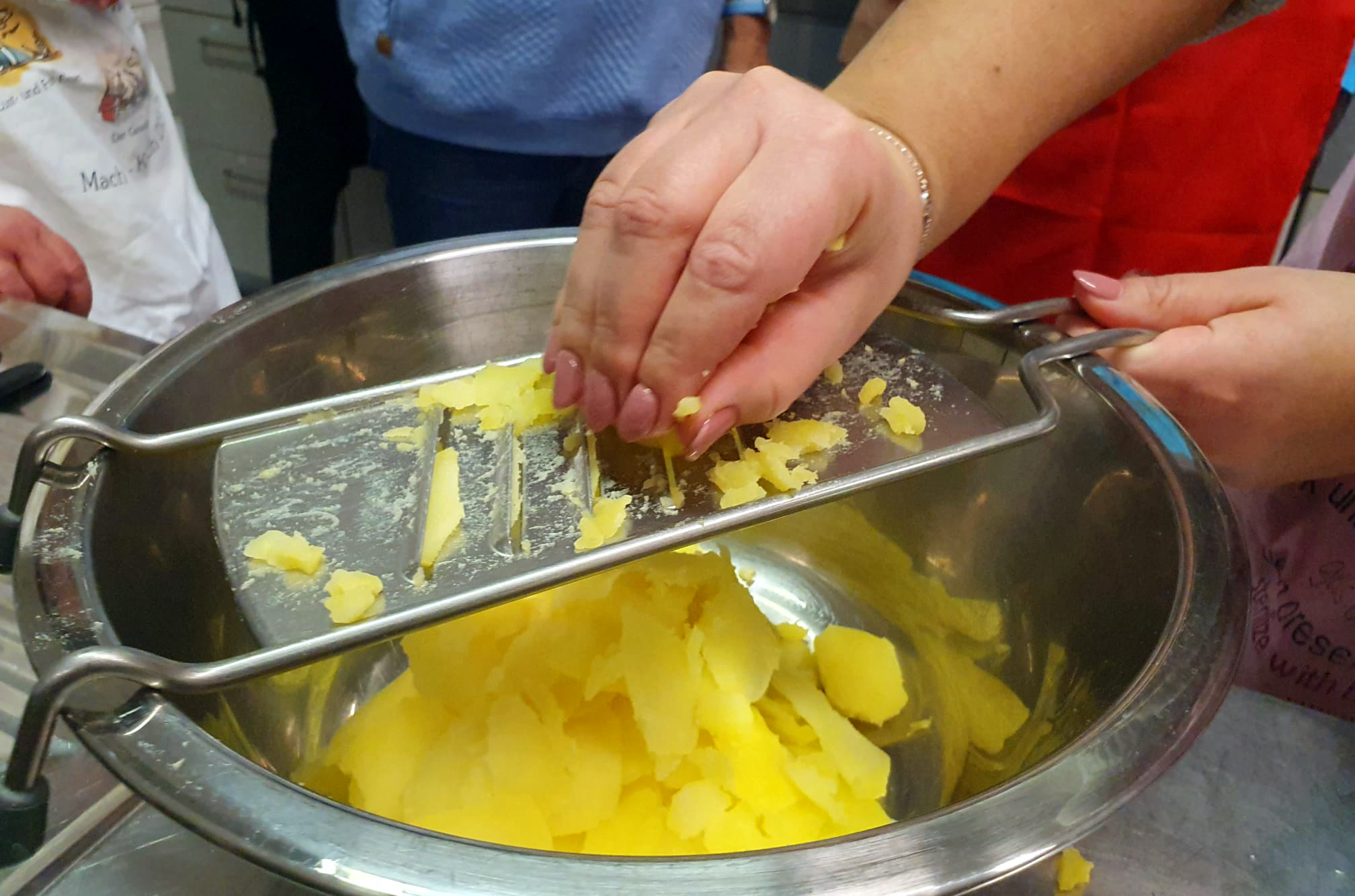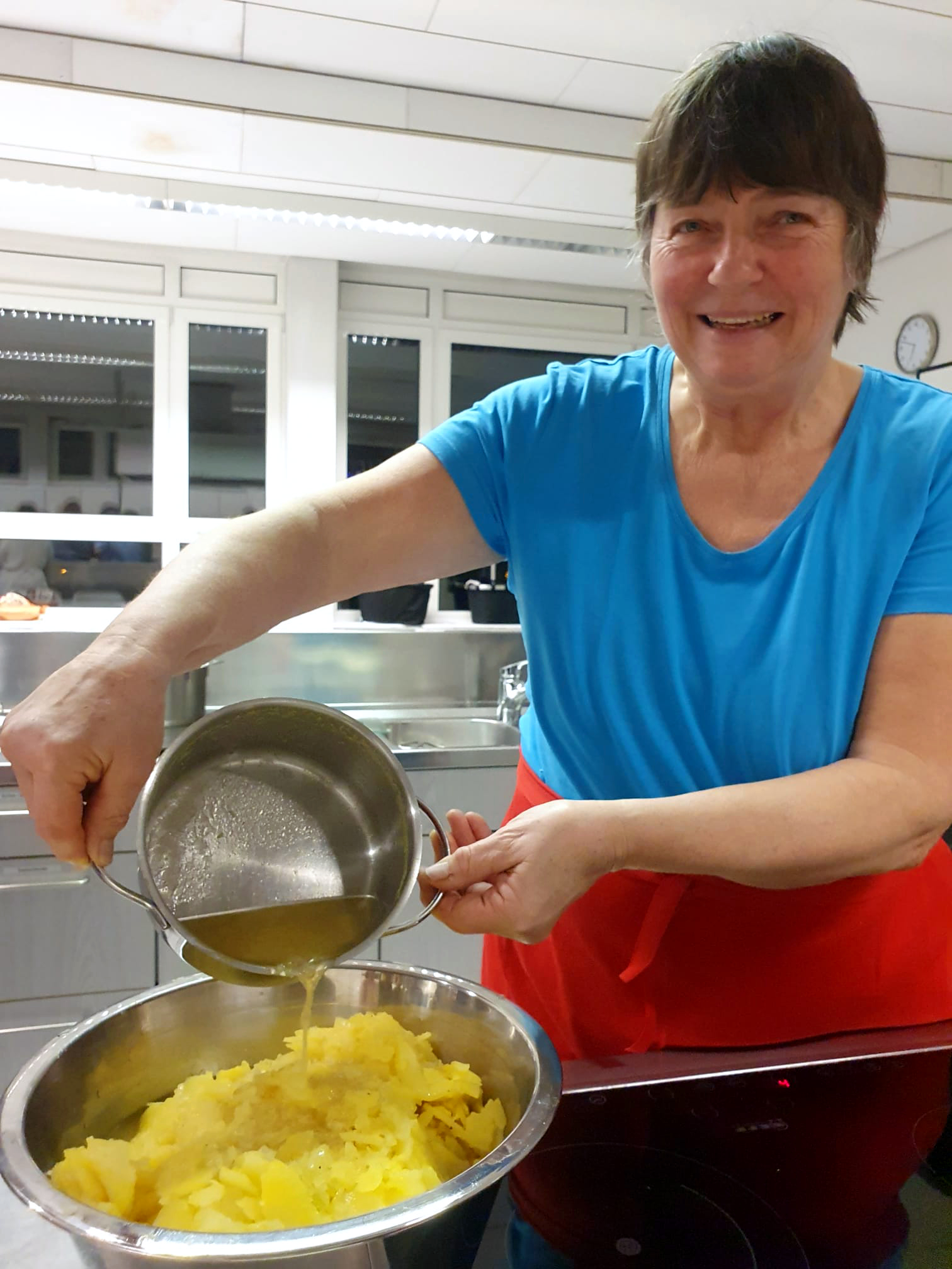 Ein schwäbischer Kartoffelsalat soll schwätza. Jede Hausfrau hat ihr kleines Geheimnis, damit er besonders gelingt. Und es ist schon so: Meiner Mamma ihr Kartoffelsalat isch immer dr Beschte! Die Kartoffeln müssen schon abgekühlt sein, ehe man sie rädelt, dafür sollte die Brühe, mit der man den Salat übergießt, heiß sein. Das ist eine Faustregel: Kartoffeln kalt reiben, den Salat dann heiß anmachen.